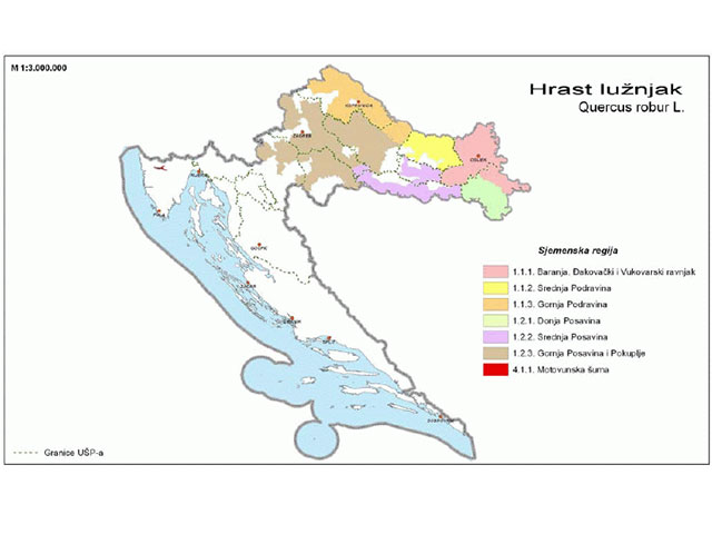 Slika 1. Pravilnik o područjima provenijencija svojti šumskog drveća od gospodarskog značaja – areal Hrasta lužnjaka (Quercus robur L.) izvor NN.