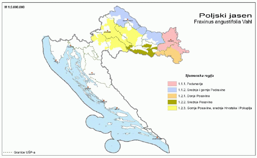 Slika 1. Pravilnik o područjima provenijencija svojti šumskog drveća od gospodarskog značaja – areal Poljskoga jasena (Fraxinus angustifolia Vahl.) izvor NN.