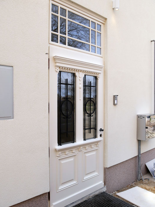 Ulazna dvokrilna vrata s nadsvjetlom izrađena su od visoko kvalitetnog drva ariša prema slici zadanoj od strane Konzervatorskog odjela Sisak. Za poboljšanje energetske učinkovitosti u vrata su ugrađena “Izo Low-e” stakla. Crna kovana rešetka dodatno je zaštitila i uljepšala vrata.