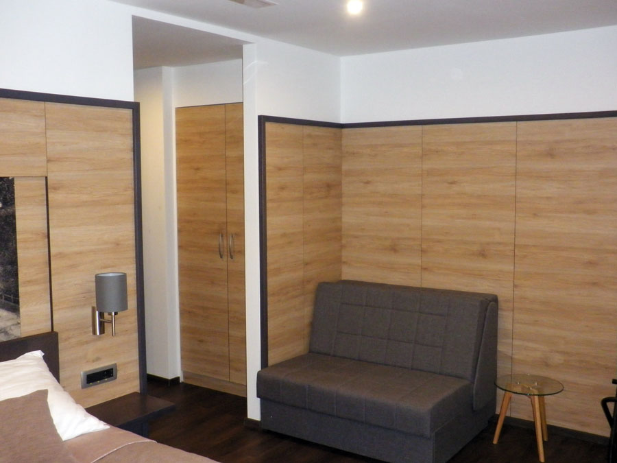 Početkom mjeseca završili smo sveobuhvatno unutarnje opremanje privatnog smještaja koji se sastoji od devet trokrevetnih soba i tri luksuzna apartmana prema najvišim standardima, sukladno željama naručitelja. Proizvode kao što su zidne obloge, ugradbeni ormari, radni stolovi, police i dr. izradili smo od furniranog hrasta s ispunom okal-iverica, te smo ih završili s transparentnim PU lakom.