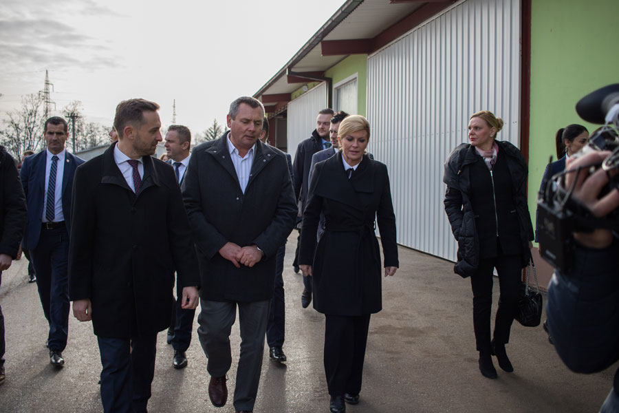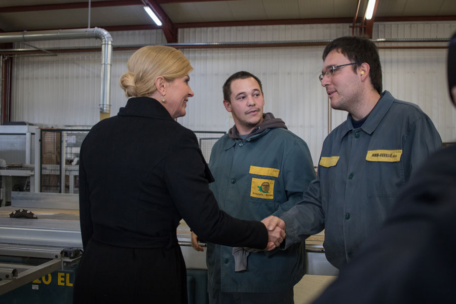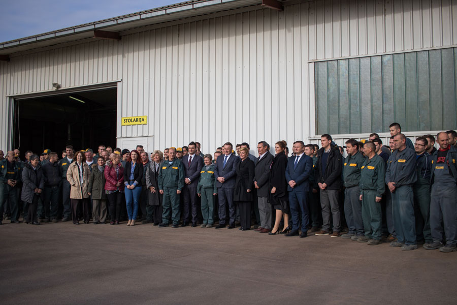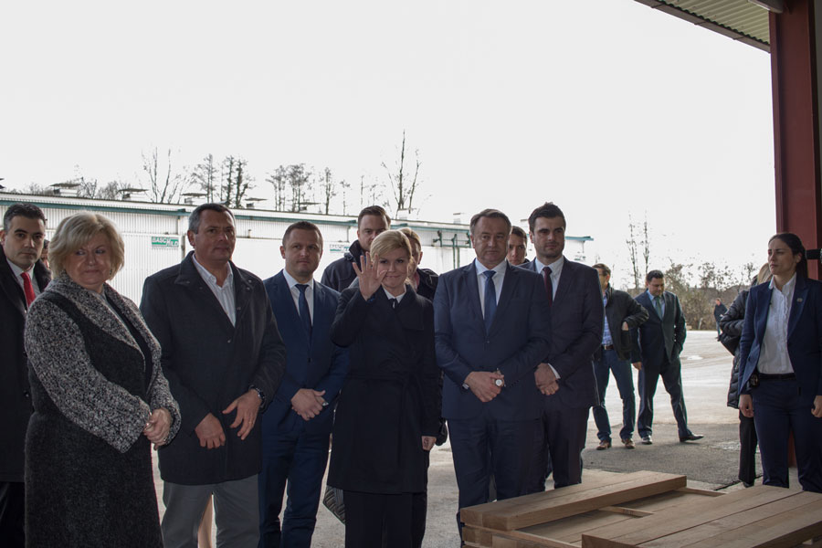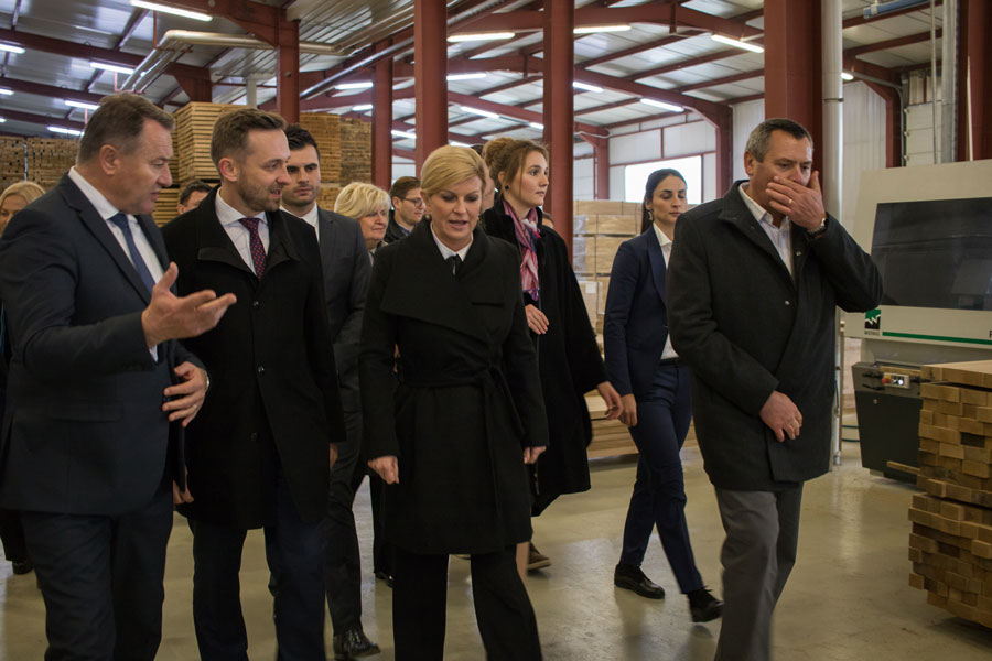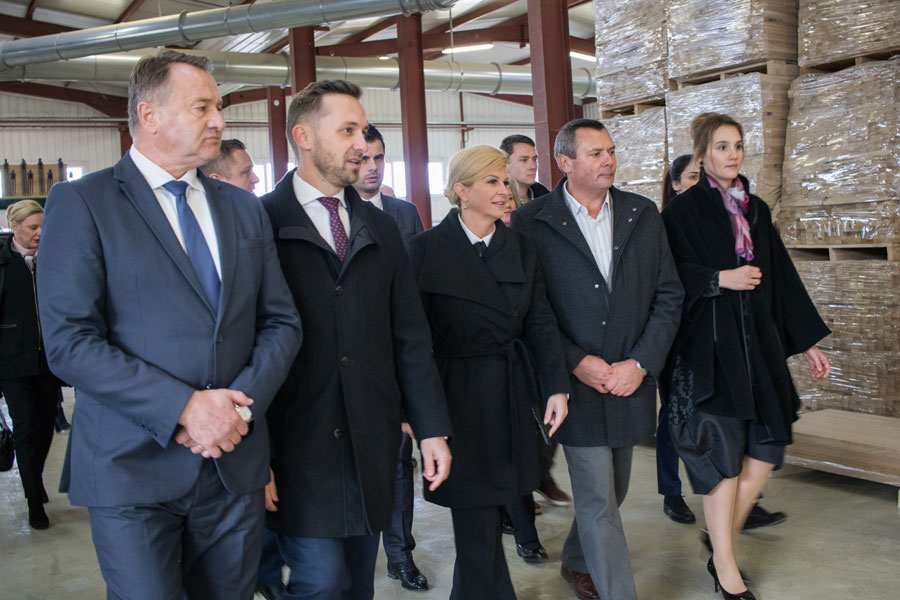 Pozdravni govor Predsjednici i izaslanstvu uputio je direktor poduzeća Marijan Vukelić. Prezentaciju proizvodnog programa i obilazak proizvodnih pogona uz izaslanstvo predstavili smo kroz proizvodne pogone pilane kao primarnog dijela koji je u funkciji daljnje prerade, te finalnog dijela što je proizvodnja furnira, masivnih spojenih ploča, podova, stolarije. Pogledom u budućnost prezentirano je usvajanje novih tehnologija u drvnoj industriji koje su predstavljene, a koje će rezultirati novim proizvodima, širenjem industrije, a pareleno time i novim radnim mjestima.