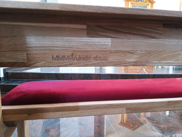 Svaka Hrastova klupa, klečalo ili hoklice izrađene su prema mjeri sa puno pažnje na detalje. Dužinsko širinski spojena ploča od čega je namještaj i izrađen dokaz je pravilne iskoristivosti drva nama dragocjenog Slavonskog Hrasta (Q. robur L.), gdje se od malih elemenata spojila ploča, a zatim napravio namještaj koji služi ljudima i narodu. To je pravilna održivost koju poštivamo.