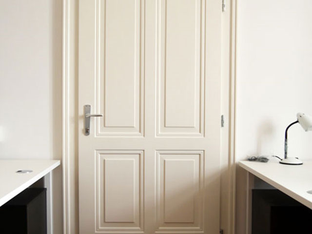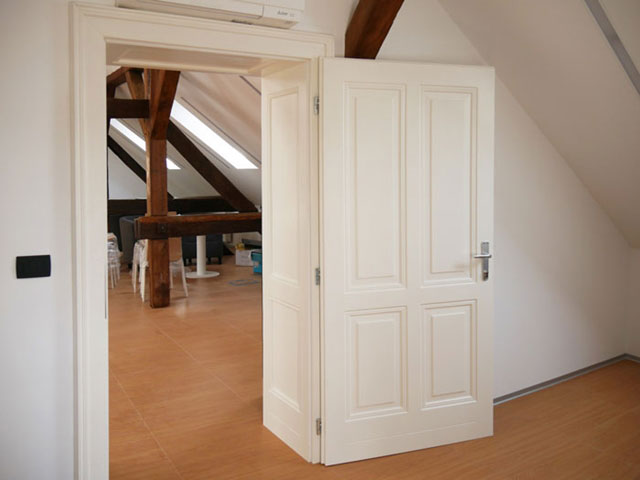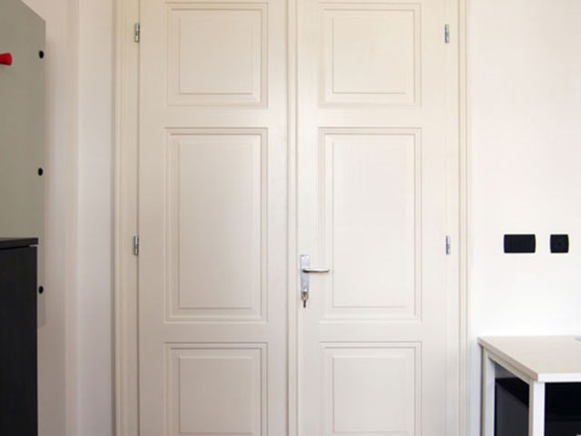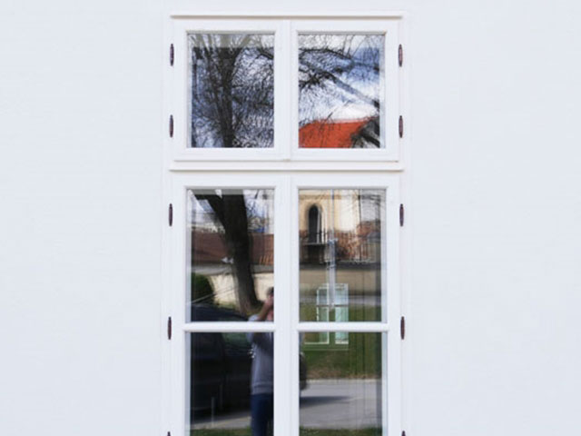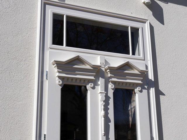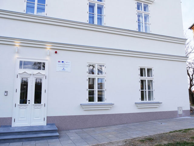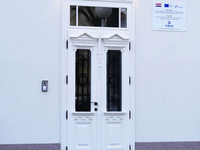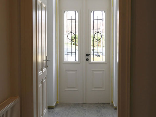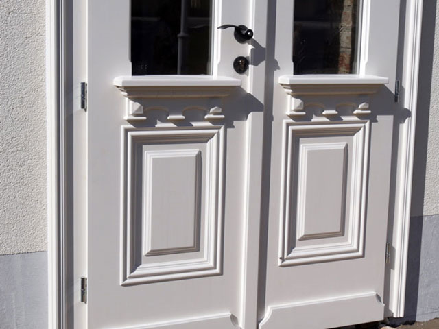Ulazna dvokrilna vrata s nadsvjetlom izrađena su od visoko kvalitetnog drva Sibirskog ariša (L. sibirica ladeb.) prema slici zadanoj od strane Konzervatorskog odjela Sisak. Za poboljšanje energetske učinkovitosti u vrata su ugrađena “Izo Low-e” stakla. Crna kovana rešetka dodatno je zaštitila i uljepšala vrata. Unutarnji interijer zgrade obilježavaju masivna sobna vrata s ukladama također "MMM-Vukelić" proizvodnje izrađene od kvalitetne Smreke (P abies L.) iz Gorskog kotara.